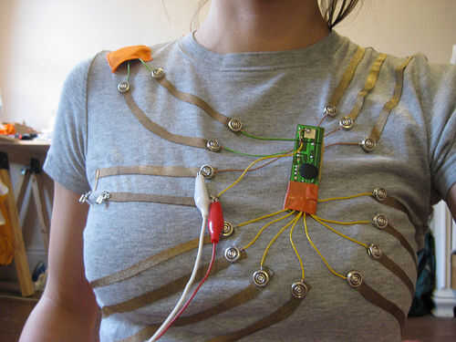 cuello acariciando usable para los días soleados. Los componentes de este circuito accionada solar están integrados en esta camiseta decorativa, explorando las posibilidades de la electrónica de la materia textil y la interacción con el sol.Siguiendo
