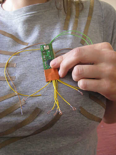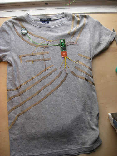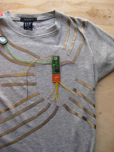 un Piano de juguete incrustado en una camiseta. Tiene 8 teclas de Do a (1 octava). Puede reproducir música simple por llevar la camiseta y pulsar el botón de tela de la camisa. Todos los componentes desde el piano de juguete (baterías, altavoz, placa