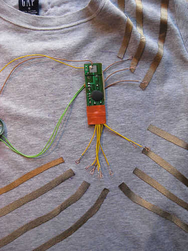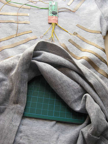 cuello acariciando usable para los días soleados. Los componentes de este circuito accionada solar están integrados en esta camiseta decorativa, explorando las posibilidades de la electrónica de la materia textil y la interacción con el sol.Siguiendo