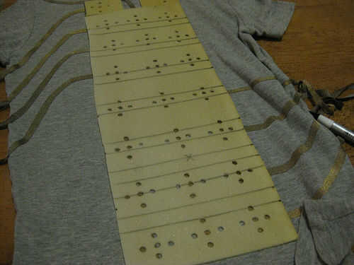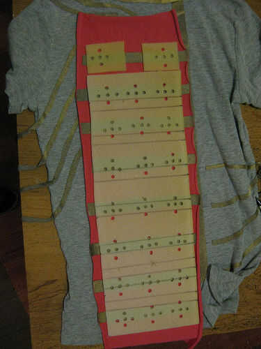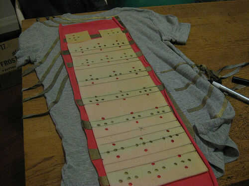 un Piano de juguete incrustado en una camiseta. Tiene 8 teclas de Do a (1 octava). Puede reproducir música simple por llevar la camiseta y pulsar el botón de tela de la camisa. Todos los componentes desde el piano de juguete (baterías, altavoz, placa