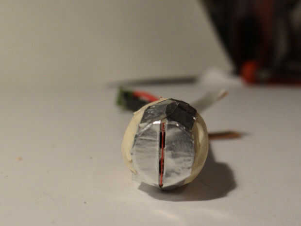 En primer lugar, envuelva el módulo láser con cinta firmemente presionado el botón del láser y así ello se ajusta perfectamente en el pedazo de tubo de PVC.