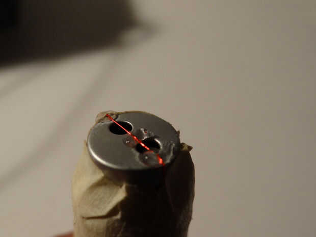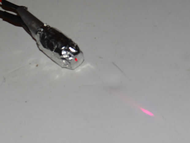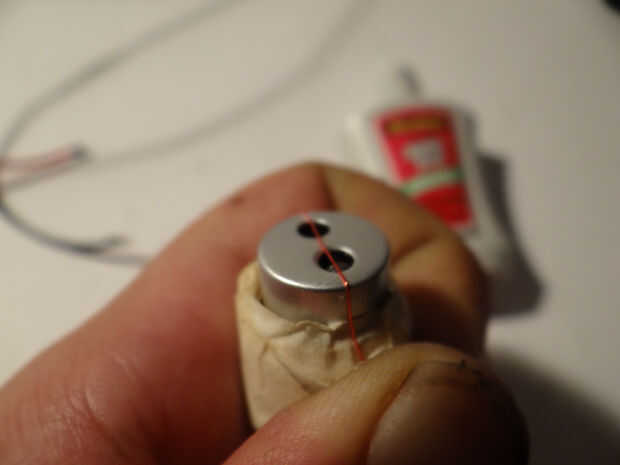 Luego, sostenga un trozo recto de alambre directamente sobre la lente del láser, como se muestra y virar en lugar con pegamento. Asegúrese que el cable esté centrado, recta y tensa. Ver las fotos.