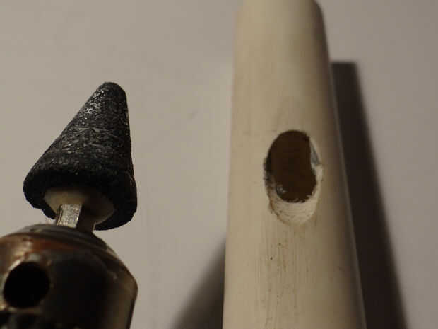 Colocación primera, medida para un agujero permitir que los cables del láser para pasar a través. Para hacer esto, perfore un agujero y alise los bordes con su poco lijado. Utilice la punta lijadora en ángulo para evitar los cables torcidos.