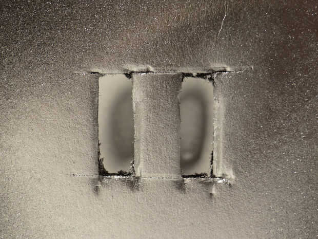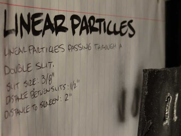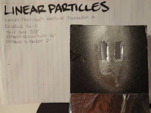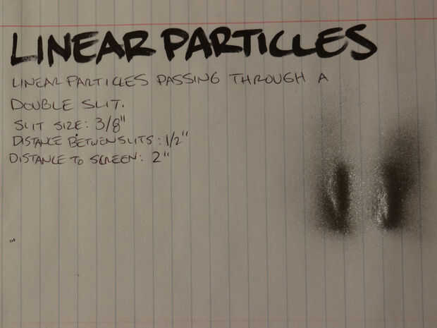 Para averiguar lo que sucede cuando las partículas pasan a través de dos ranuras que consideramos. Si tomamos un trozo de tablero y corte dos ranuras en ella y delante una superficie limpia, ¿qué va pasar si pulveriza las partículas de, digamos, pintura de aerosol en las dos ranuras? Pruebe por sí mismo o ver las imágenes del resultado. Cuando las partículas pasan a través de las rendijas de las partículas se dividen en dos grupos que aparecen como dos marcas en la superficie detrás de las ranuras, como se muestra arriba.