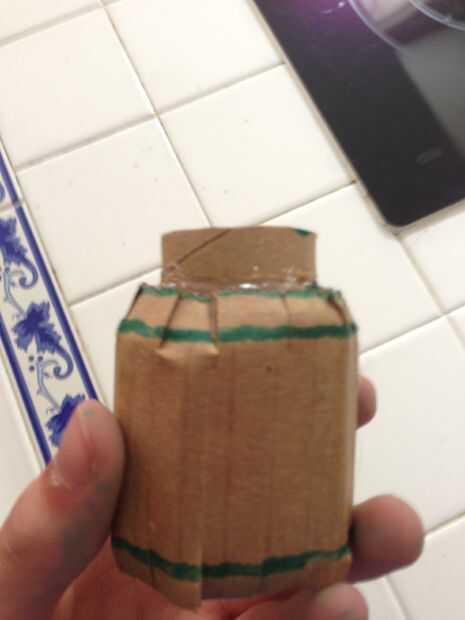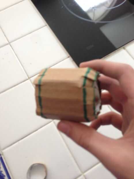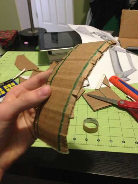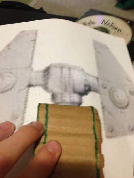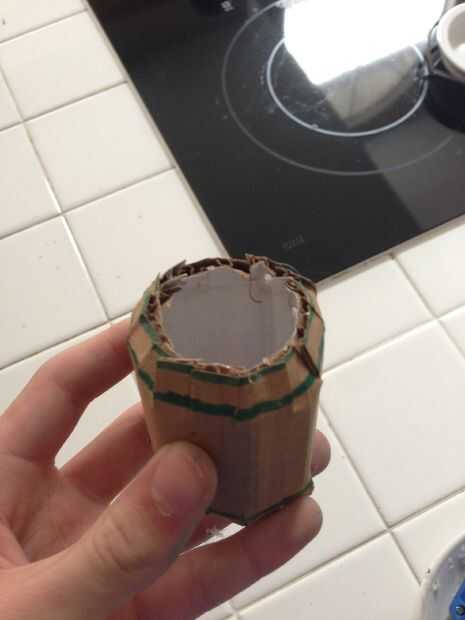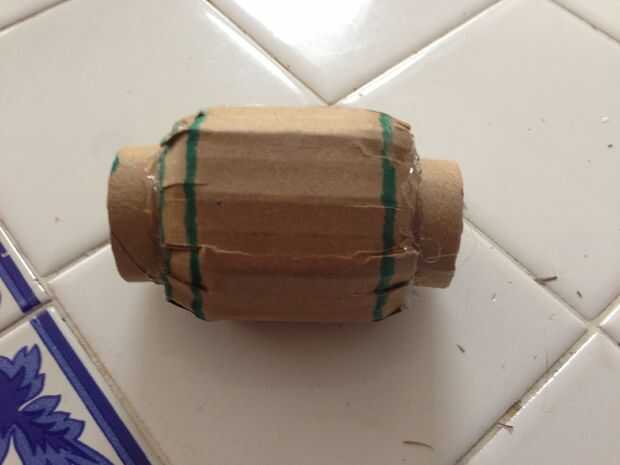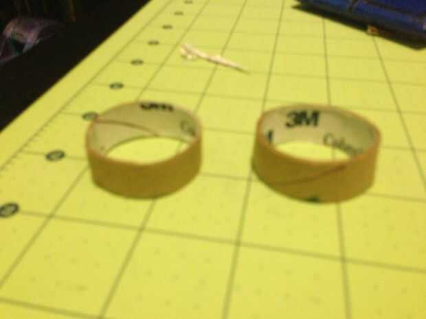 This part took me a while. Cortar los anillos del tubo de Gasa y apartarlas. Ahora, recorta una tira de cartulina y rodillo para que coincida con esa forma en medio de la llave. Cortar las pestañas en los bordes y salir de la pistola encoladora. Pegue la tira en la forma de rollo, pero sólo en la parte sólida, no las pestañas. Doble las lengüetas en el medio y pegamento en un tubo de gasa en cada lado.