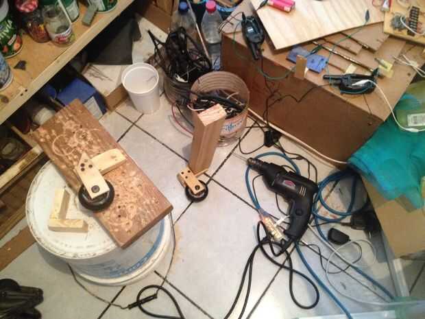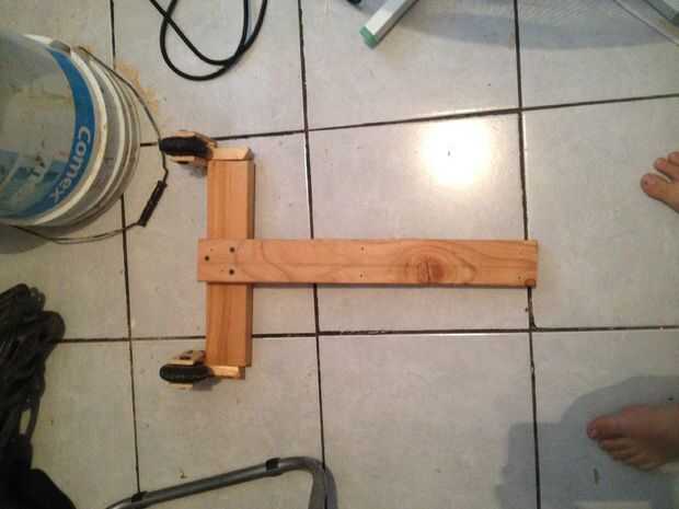 Para la rueda de los patines rosca también pedazos de madera contrachapada de 3/8 de pulgada a un espaciador que fue un poco más ancha que la rueda. Había tallada la madera por lo que las ruedas no rocen. Luego perforar un agujero muy recto e instala la rueda con rodamientos.