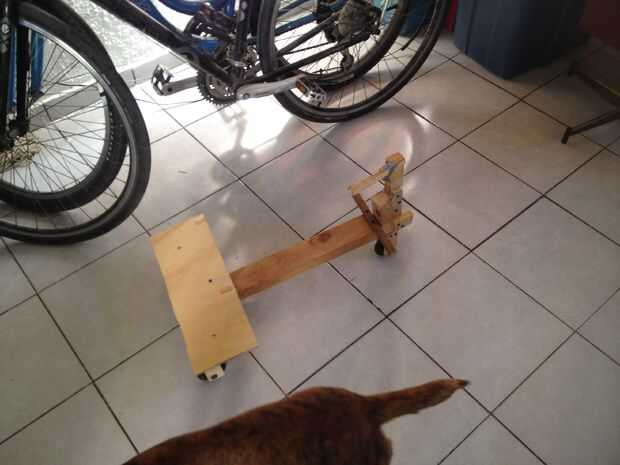 Había atornillado la puerta hing de la rueda delantera. Me aseguré que el eje de la rueda fue detrás del eje de bisagra para que la dirección era estable.