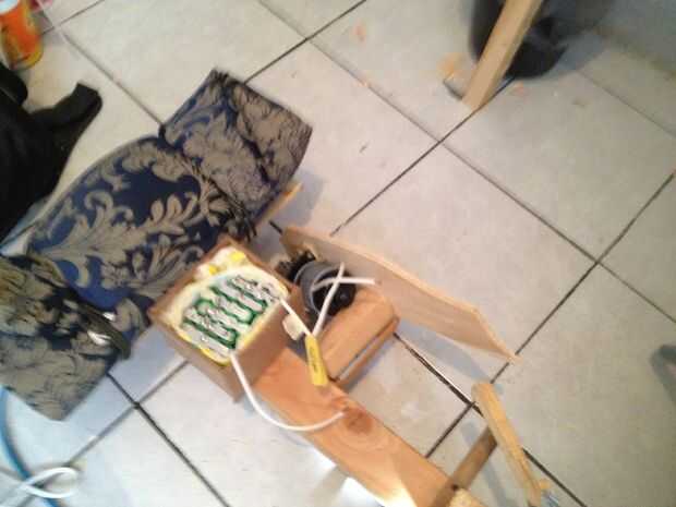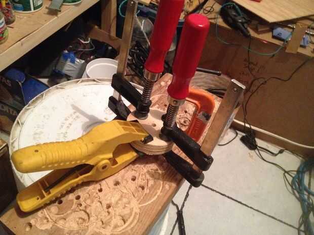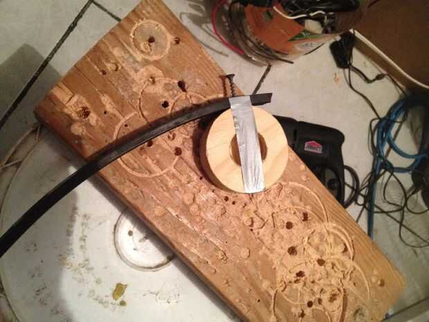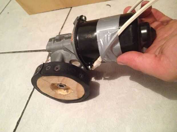 Construí el volante cortando dos círculos de 3 pulgadas de madera contrachapada de 3/8 de pulgada usando mi agujero de 3 pulgadas Sierra. Pegan estos dos ruedas. Entonces había atornillado la atadura de caucho en la rueda con 8 tornillos de 1 pulgada. A había jodido esta rueda directamente en el motor. El motor sólo gira a tal vez 60 rpm por lo que este hace para un coche de la bonita casa lento. Este coche fue diseñado solamente para conducir en piso muy lisa como azulejos, baldosas y madera. Esto no es un coche de la alfombra.