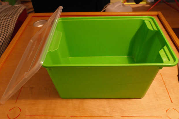 Ya que quería mantener este proyecto barato compré las cajas de almacenaje más baratas que pude encontrar en IKEA, que eran las cajas GLES. Tuve suerte de encontrar una caja transparente y fuerte plataforma gratis ajuste bien las cajas de almacenamiento. Tomé composta, suelo y piedras del jardín.