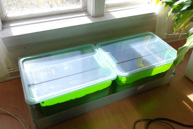 Usando sólo una semilla en cada agujero resultó para ser un error, que nada surgió de ellos. En cambio, las semillas que había en el suelo que he utilizado empezaron a crecer (ver cuadro 2). Esta serie me hacia atrás algún tiempo, tuve que quitar las malas hierbas y plantar nuevas semillas. Esta vez hice surcos y sembraron semillas de 2-3 en el mismo lugar y luego se extendió a las semillas en líneas en el suelo. Como se puede ver en cuadro 3 que esto dio el resultado que quería. También he añadido pequeñas señales para recordar había plantadas cada tipo de semillas en las cajas. Durante las primeras semanas hasta que las hierbas habían crecido unos pocos centímetros de altura tenía las tapas transparentes en las cajas para hacer un invernadero debajo de los párpados.