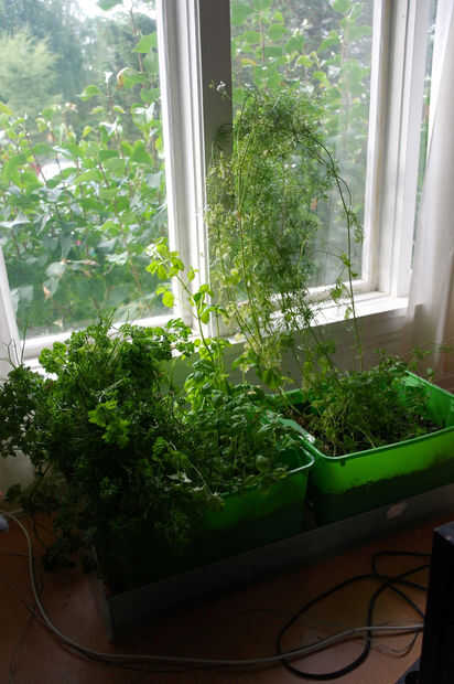 Como se puede ver, el perejil en particular creció en plantas grandes. Así que lo corte hasta dar la albahaca junto a algo más de luz. Encontré que el perejil creció rápidamente, así que no era un problema para algunos cortado y dejarlo crecer otra vez.