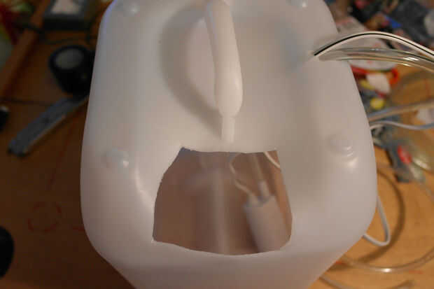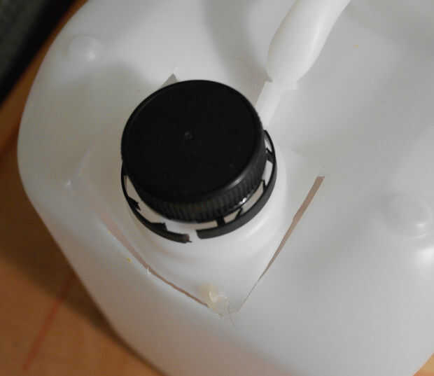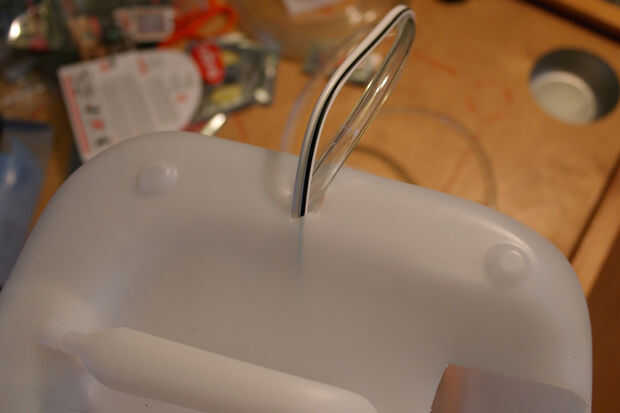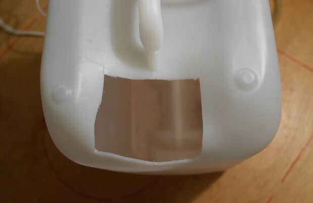 Para hacer más fácil rellenar el recipiente con agua y también Conecte la bomba al contenedor corte una abertura en la parte superior del envase sólo lo suficientemente grande como para encajar mi mano a través de él (Foto 2 y 3). También corte una abertura más pequeña para el agua tubo y cable de alimentación de la bomba (Figura 4). Luego probé la bomba dentro del contenedor.