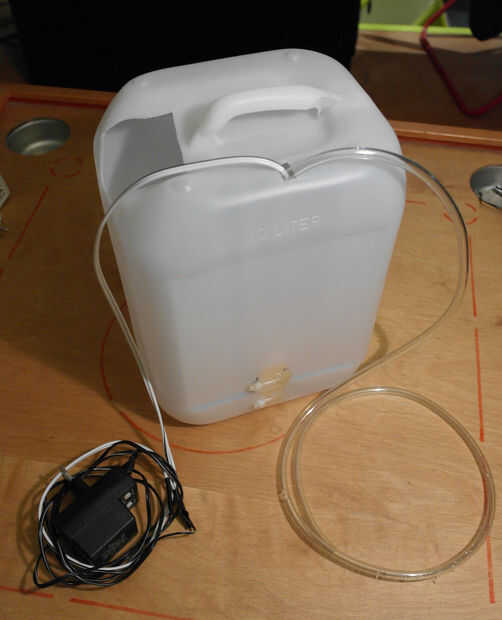 La imagen muestra el sistema de riego listo para usar. El adaptador se enchufa en el temporizador que se puede programar en cualquier modo con 1 minuto como el intervalo de tiempo más corto. Así que puedo el sistema de agua las plantas tan a menudo como necesito. Puesto que la bomba salidas aproximadamente 1 litro / minuto esto es la menor cantidad de agua que puedo conseguir a la vez. Pero esto está bien para mí que la caja grande que están de pie en las cajas de hierba puede caber hasta 5 litros de agua con las cajas de la planta en él. El extremo del tubo de agua puede fijarse en el interior de la caja más grande, o ser utilizado para otra planta en el futuro.