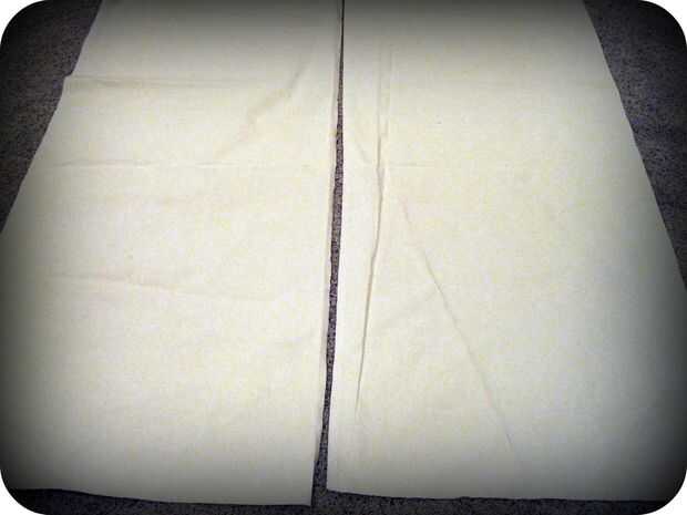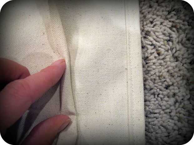 Lienzo es normalmente 60" de ancho. Cortarlo por la mitad longitudinalmente por lo que es 30" de ancho. Usted será capaz de hacer 2 esteras. Para terminar los bordes crudos, doblarlas bajo 1/4", luego doble bajo otra vez y coser todo alrededor. Si la tela está arrugada o arrugada, ahora es el momento de lo hierro a plano.