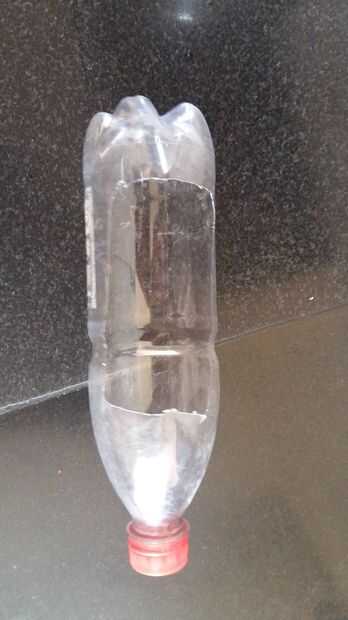 Tome una cartulina vacía caja redonda puede ser una caja de galletas o cualquier cartón redondo con tapa. la misma del centro de la corte en forma de rectángulo. Luego tomar una botella de coca-cola vacía y cortar esto también en forma de rectángulo como aparece en la imagen. Asegúrese de que la tapa esté bien cerrada. Introduzca la botella en la caja y cerrar la tapa.