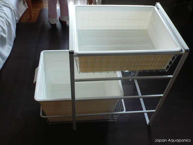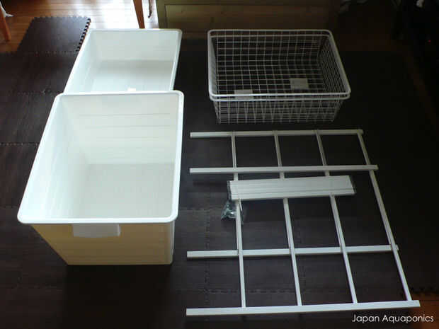 Utilizamos la cesta de alambre como soporte para el recipiente de plástico de 25l para el growbed. Esto no es estrictamente necesario para el tanque de pescados de envase de plástico de 50l en la parte inferior si usted acaba de poner el recipiente en el piso. Usted puede recortar el borde plástico en el contenedor superior para un mejor ajuste y también cortamos las asas de los extremos del contenedor - pero otra vez, no es estrictamente necesario. Para cortar el plástico sólo utilizamos una pequeña sierra, pero también puede utilizar algunas pinzas de alambre estándar.