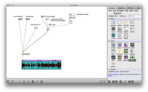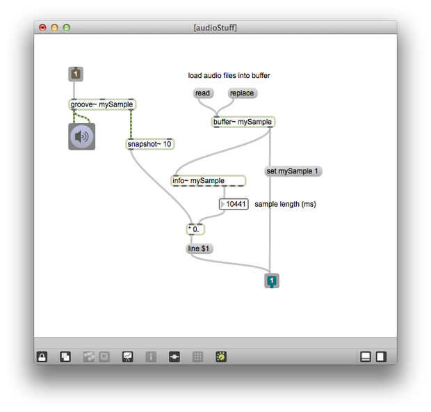 Para conectar a estos objetos desde el exterior, crear objetos de entrada y de salida. Cada vez que agrega una entrada a su subpatch, verá una entrada aparece en la parte superior del objeto patcher en tu parche principal, lo mismo sucederá con puntos de venta. Conecté mi cabezal dibujo piezas y mi búfer ~ objeto a mi forma de onda ~ objeto a través de una toma de corriente en el patcher. También conecté la sig ~ y otros mensajes de ranura en la ranura ~ a través de una entrada en el patcher.