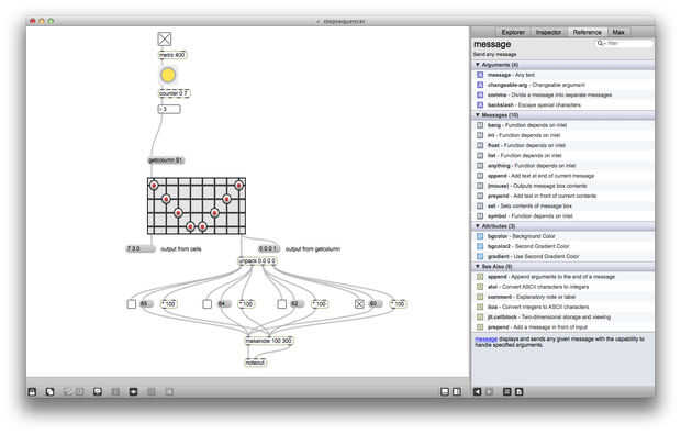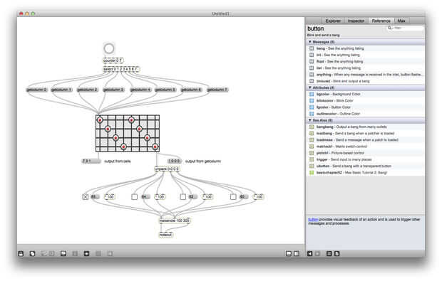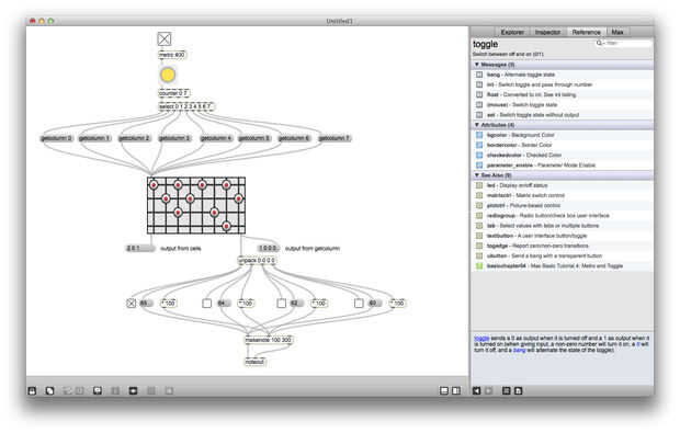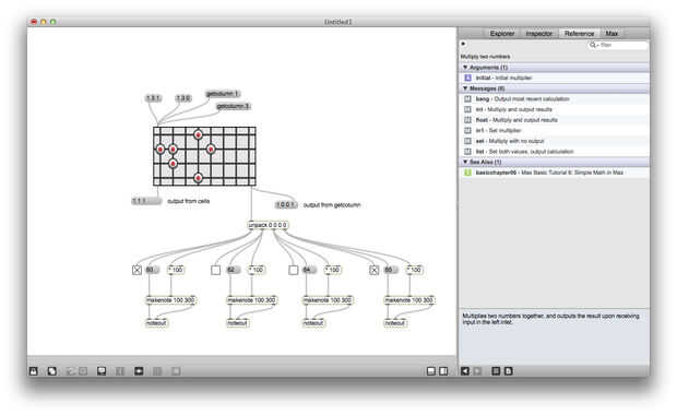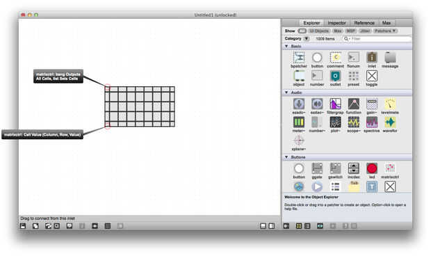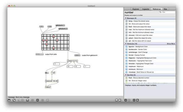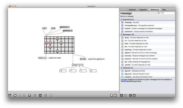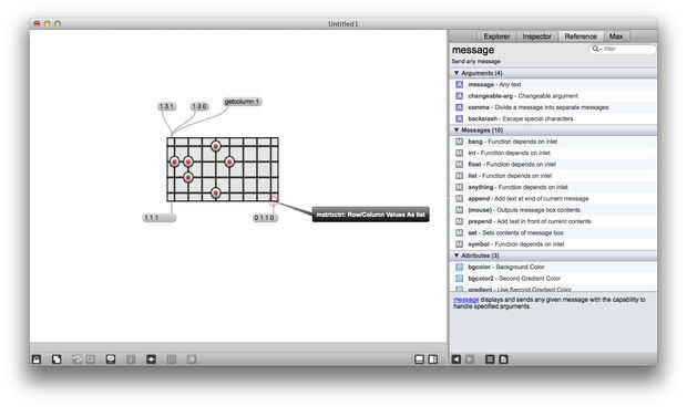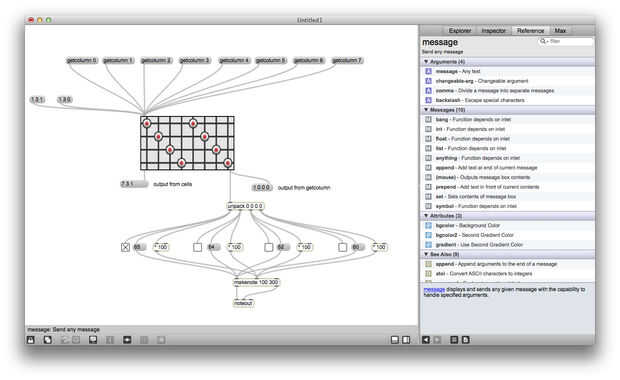 Matrixctrl es uno de mis objetos favoritos de Max, es realmente útil si alguna vez desea crear una interfaz de red o un secuenciador. Matrixctrl objetos almacenan un conjunto de Estados y proporcionan una interfaz gráfica para la interacción. Puede enviar mensajes (listas de la forma x y estado) en un matrixctrl a través de su entrada izquierda y leer los cambios en la matrixctrl a la salida de la izquierda. También puede enviar mensajes como "getcolumn 4" en una matrixctrl a leer todos los Estados de la columna 4 a la vez, estos Estados se enviará a la salida de la derecha.
