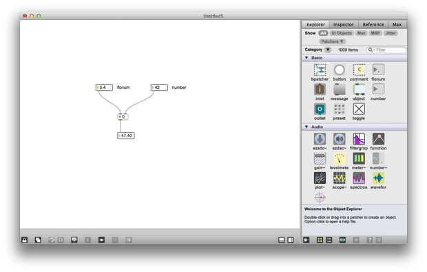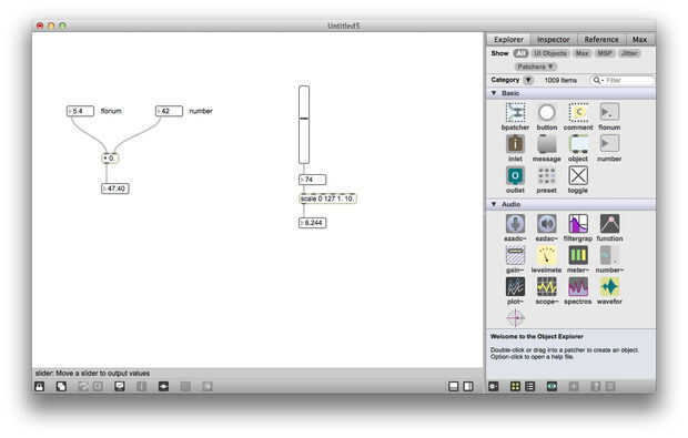 Trate de configurar los parches que se muestra arriba. Aviso cómo la + y sólo generará números enteros si no dices que quieres que los flotadores de salida estableciendo el argumento opcional en una carroza (utiliza "+ 0.0"). El objeto de la escala es útil para convertir un rango de valores en otra gama. Pero otra vez, por defecto el objeto escala se todo para enteros a menos que se indique no estableciendo sus argumentos opcionales (observe la diferencia de comportamiento entre "escala 0 127 0 10" y "escala 0 127 0.0 10.0".