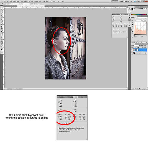 Primero vamos a ajustar los aspectos más destacados. Como ya he mencionado antes, en esta fotografía, que necesitaba ajustar el magenta, por lo que fui a la capa verde y tiró de la curva hasta tanto el magenta y el amarillo fueron en 7% y el cian fue 5%, (Recuerde, sólo estoy ajustando la curva verde, el otro números se mueven su propia con su curva, así que mantener un ojo en ellos).