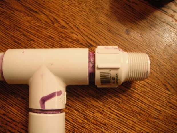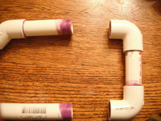 Vamos a empezar con la acción. La mayoría imposrtant para todos de la misma es para asegurarse de que todas las piezas son rectos y alineados entre sí. Primero poner en el talón hacia fuera en la parte inferior de la Tee. Siguiente la pieza más larga en el lado de la camiseta. Será la parte superior de la culata. Sugieren esperar para poner en cualquier esquina se dobla sin embargo que será más fácil ponerlos más tarde. Ahora el pegamento en los 45 * de la curva en el trozo inferior hacia fuera. Asegúrese de está alineado con la primera de la stock.when que se seque colocar la otra pieza en el lado opuesto de los 45 *. Debe ser sobre un thatn más pulgadas el talón hacia fuera. Nuevamente Asegúrese de alinear antes de que el pegamento se seca. Ahora añadir la pieza desde el otro lado de que 45 *. La pieza, solo fijarse debe ir parralle con la parte superior de la culata. Toma la última pieza de pvc que corte para el caldo y las 2 esquinas a éste. Estas son las piezas más importantes para tener derecho. Cuando los seco usted puede fácilmente poner en el resto de la población, luego péguelo. Debe haber al otro lado de la población todavía sin usar, poner en un trozo de 3/4" hacia fuera y el pegamento en el adaptador macho. Ahora tienes el stock