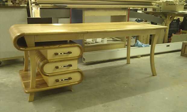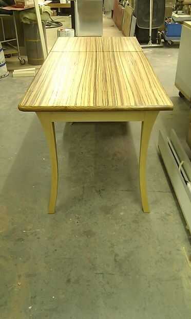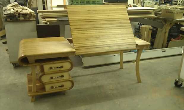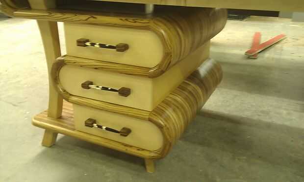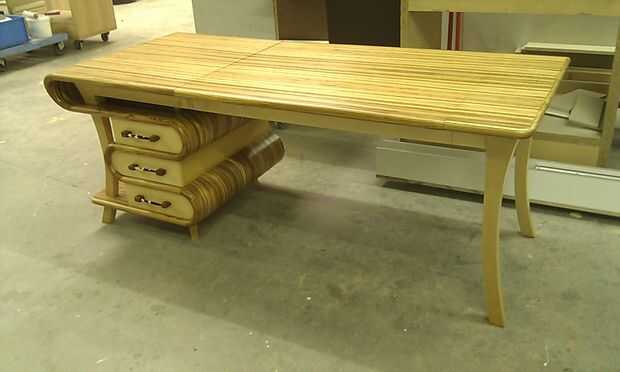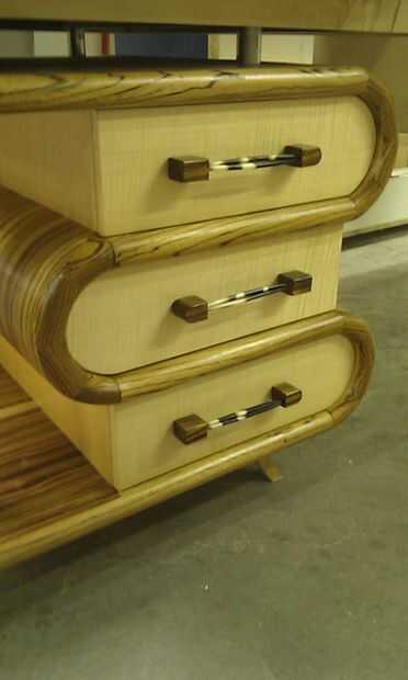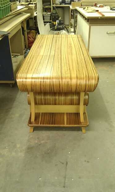 Se hace de madera de zebrano africano y chapa, madera de Arce Europeo, el marco está hecho de madera de haya, MDF y lo que aquí llamamos en los países bajos "Buigplex" no estoy seguro lo que el nombre técnico inglés correcto es pero ruffly traducido "Madera contrachapada de la curva"