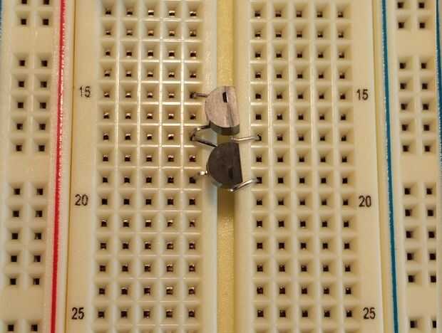 Los transistores deben puente medio de la placa para ello doblar la curva trasera, colector de la pierna la base y patas emisor hacia adelante. Revise la hoja de especificaciones en la parte que usted tiene que encontrar las piernas correcto.