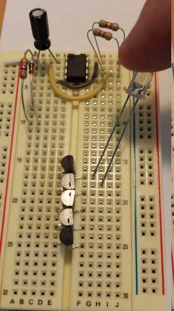 Conecte el diodo del pin 3 del chip a fila 10, el anillo alrededor del diodo debe ser menos a la fila de pines 3 fila 10. Conecte la resistencia de 2 k del pin 3 del chip a una fila vacía 10. Los agujeros en fila 10 empiezan a llenar, así que conecte un cable desde la fila 10 a fila 13. Esto le dará 4 nuevos orificios en la placa que están conectados a fila 10.