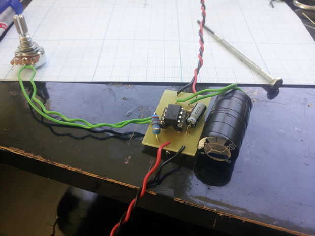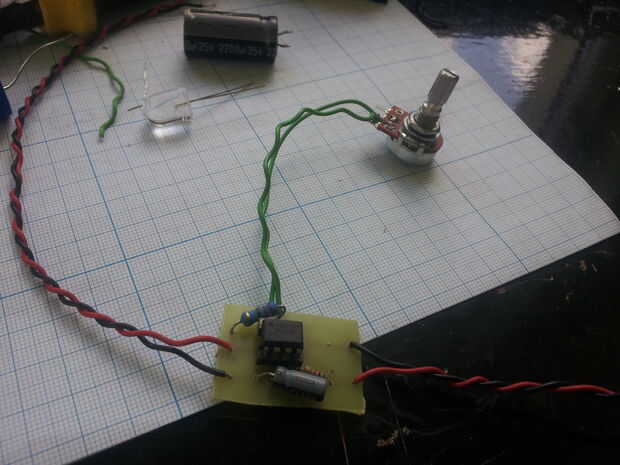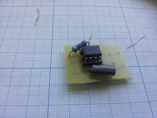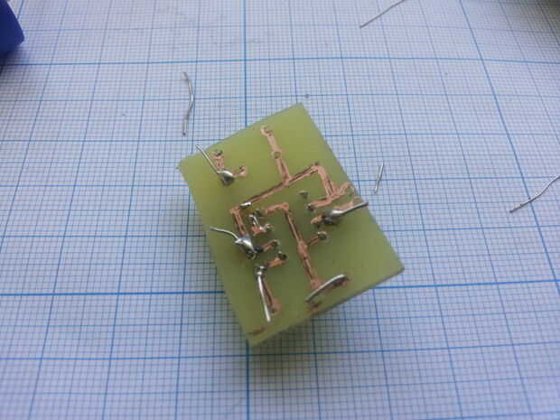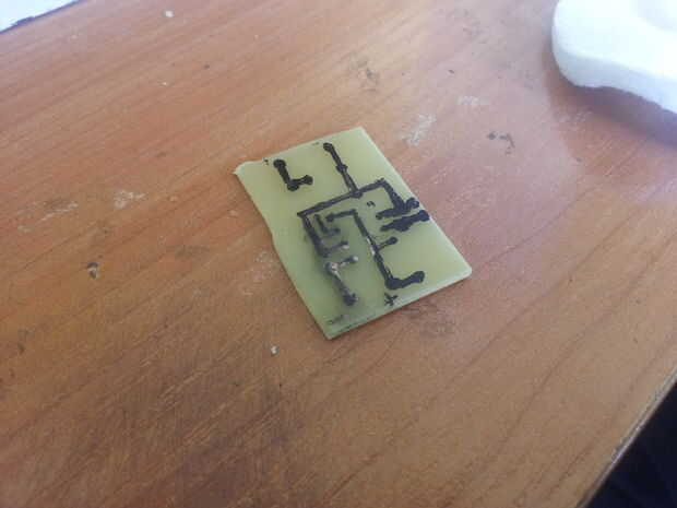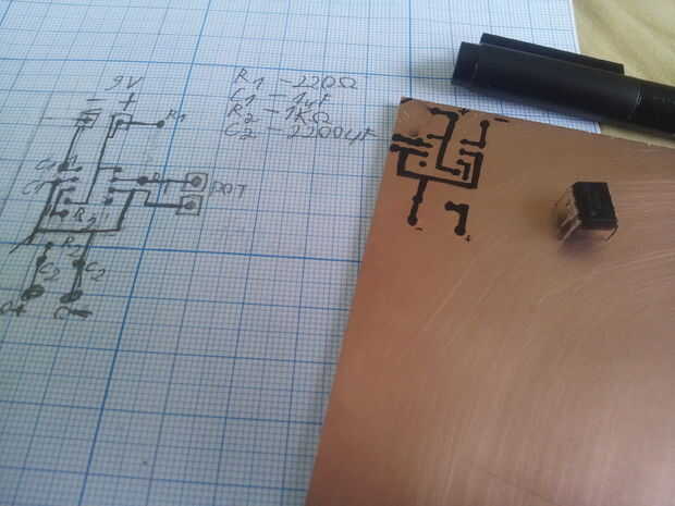 - Descargar la disposición del PWB apoyé encima, mina dibujaba directamente sobre el tablero con un marcador de PCB (ver fotos), pero usted puede imprimir el esquema en papel brillante, usando una impresora láser y transferir a la junta con una plancha (ver método de transferencia de toner)