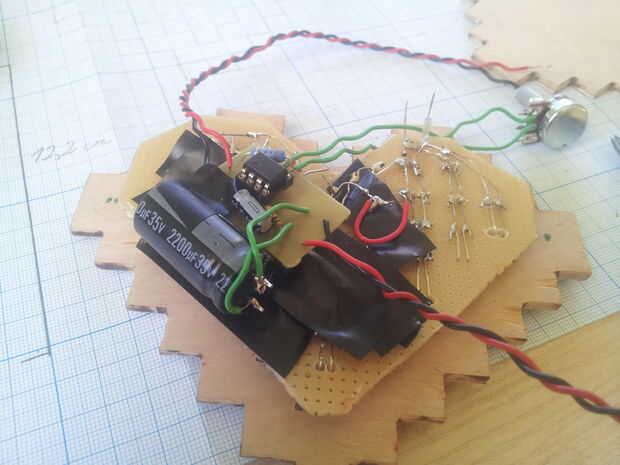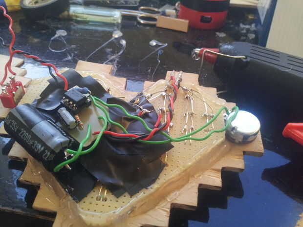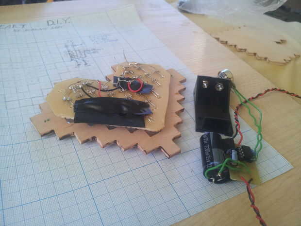 Creo que bastante sencillo, sólo tiene que conectar todos los cables de donde pertenecen, aislante pins de la matriz así que usted puede colocar el circuito en él, ponen el portapilas en la parte posterior, instalación el interruptor, instalación el potenciómetro.