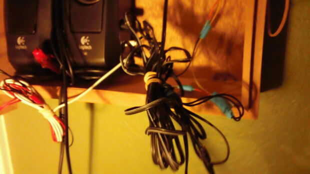 3. altavoces regulares (tienen dos cables de crudo provenientes de ellos)