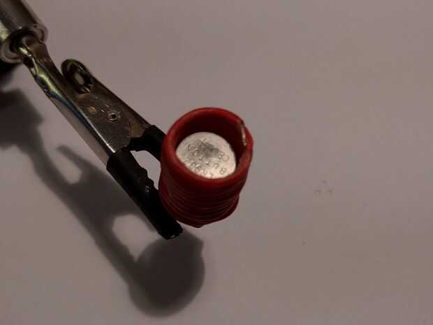 Ahora necesitamos conectar estas 2 piezas. Para ello, soldar la nueva pieza a la otra junta de soldadura. Reforzar con algún pegamento, y las 2 partes deben formar un conjunto. Las pilas de botón deben caber perfectamente dentro.