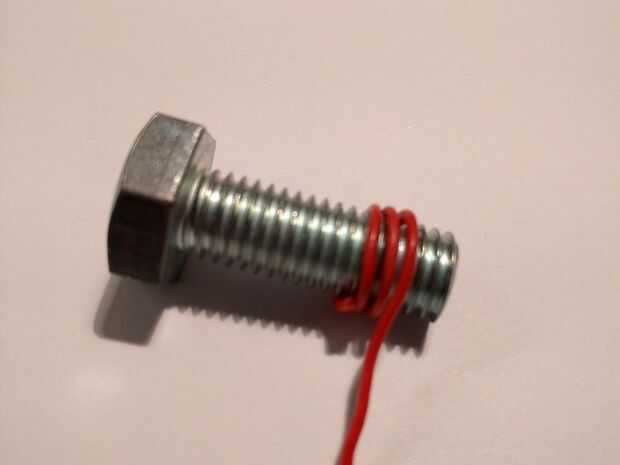 Para la parte restante del cuerpo, tome su perno M10 y tuerza el alambre alrededor de él. Es importante seguir los hilos de rosca del perno, ya que necesita aceptar un tornillo más tarde. Tuerza el alambre hasta que tenga una altura de unos 15 mm. manténgalo junto con pegamento, como la parte anterior. Quitar una pequeña parte del aislamiento en ambos extremos.