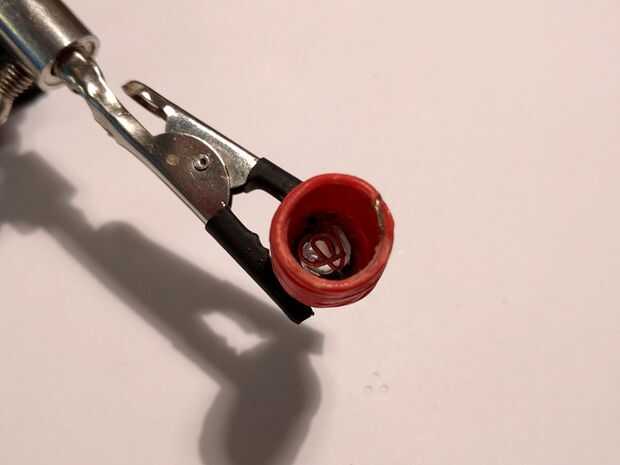 Cuando usted alcanza el extremo del porta, Rizo el cable más largo (lado positivo) del led que actúa como un resorte. Doble el cable más corto (lado negativo) al lado y soldadura al cable. Luego ajuste del cable corto (mantener el liderato, que necesitaremos más adelante). Agregue pegamento caliente en la parte inferior del led, para evitar cortocircuitos.