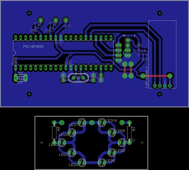 El diseño fue hecho en CAD EAGLE y fue basado en PIC18F4550 microcontrolador del Microchip. Sólo unos pocos pernos fueron utilizados para i/os, un módulo de bluetooth HC-06 para comunicarse con el teléfono, una matriz de LEDs en las flechas que apuntan a la derecha y a la izquierda y una conexión USB para flashear a través de un gestor de arranque HID. No te olvides de añadir un interruptor externo ya que se colocaba dentro de un recinto.