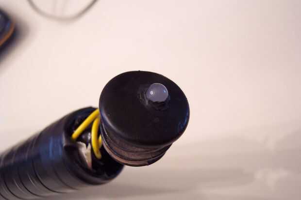 Al agregar cinta bici, encontré que si cinta ligeramente sobre los botones (de modo que no presionen) entonces están completamente ocultos y son impermeables! También, con un poco de sugru usted puede impermeabilizar los LEDs y tapones así! Lo único que necesita un paquete, tan abierto para arriba y el sugru del rodillo en un cilindro largo. Necesita cuatro de estos en segmentos, dos para envolver alrededor de los LEDs y dos para las tapas. Empuje su LED a través de las tapas y justo en la base donde el LED afecta la envoltura del cap final la cadena sugru alrededor de él y lisas en ambas superficies. A continuación, empuje las tapas casi completamente en las barras, pero lo suficiente como para envolver sugru entre ellos y el borde de su manillar. Empuje el manillar completamente en y lisa sugru alrededor del exterior. El manillar es ahora impenetrable!