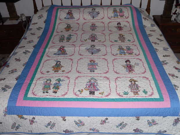 Esta colcha con encanto ofrece un 81 "x 43" muñeca disfrazados de panel o panel de la tela de su elección. El panel central es anillado por 3 emparejar telas para acentuar el diseño. En primer lugar, coloque la tira verde 1 1/2 "x 81" a los lados y una 1 1/2 "x 45 1/2" tiras en la parte superior e inferior. En segundo lugar, coloque las tiras de lado de color de rosa 2 1/2 "x 83 1/2" y las 2 1/2 "x 49 1/2" superior e inferior tiras. En tercer lugar, fijar las tiras del lado azul 3 1/2 "x 87 1/2" y las 3 1/2 "x 55 1/2" superior e inferior tiras. A continuación, fije las coordinación muñeca 9 1/2 "x 93 1/2" lado tiras de la frontera y la tira inferior de 9 1/2 "x 73 1/2". Utiliza una costura de 1/4" para todos los procedimientos.