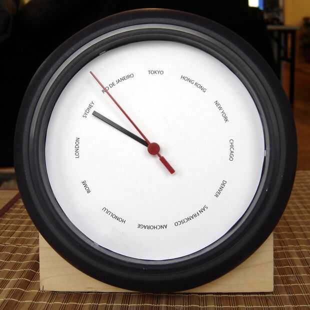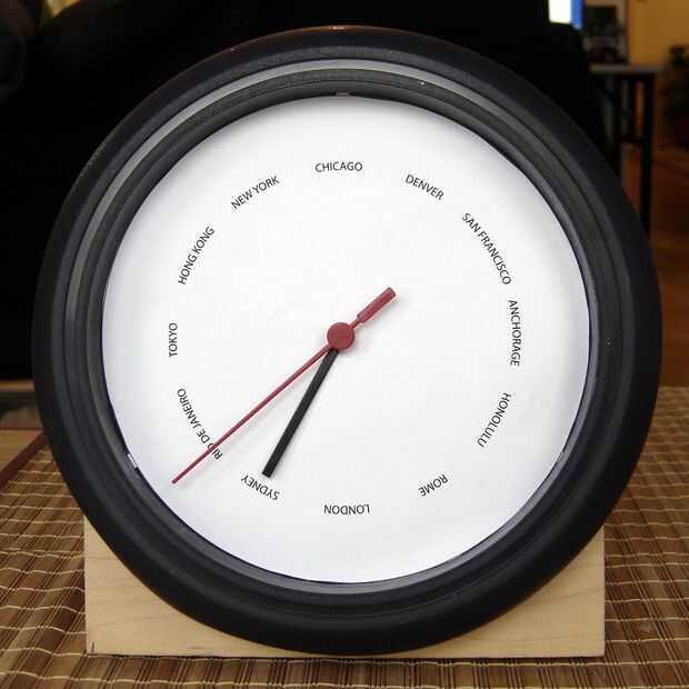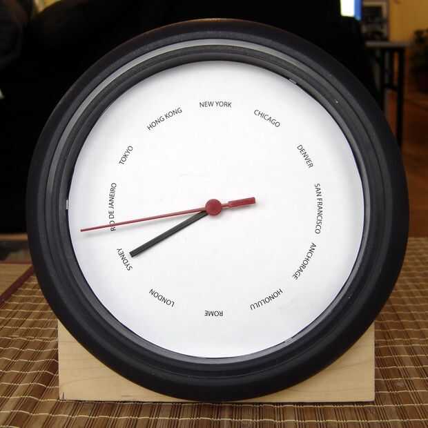 En el interior, vi un reloj interesante por Charlotte Van Der Waals. Puede ver versiones de aquí. Básicamente, el reloj gira a 12 puntos diferentes, cada uno con los nombres de dos ciudades en relieve en él. Es un truco. Una rotación de 30 grados avanza de la mano de la hora o una hora de nuevo. ¿Clever, pero casi demasiado bueno para ser verdad, correcto?