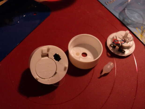 La batería, interruptor y LED están todos en una sola unidad. Bono es que parpadea por lo que anima un poco la luz. La única pega de que es un poco débil así que no realmente luz hasta la gruesa mano de plástico translúcida. Supongo que se puede cambiar hacia fuera el LED por uno más brillante.