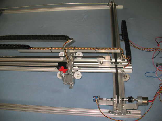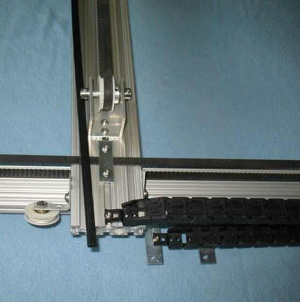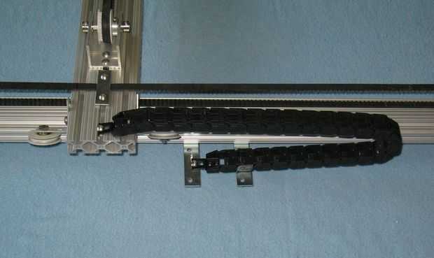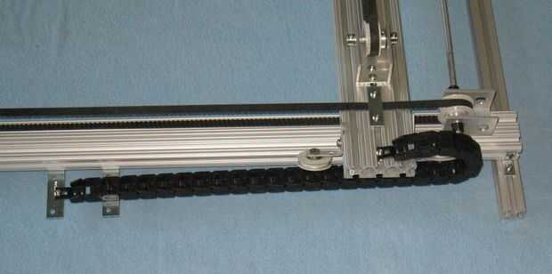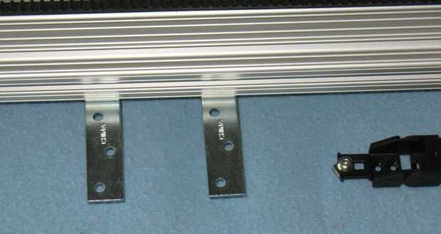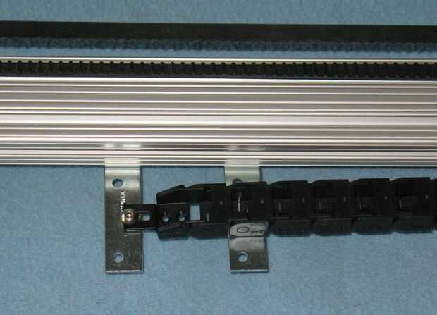 Para el eje Y, el transporte rodea el eje entero así que no podemos montar el portador del cable en el centro de la ranura. Así, se construyó está parado un par de corchetes angulares y corte un pedazo de U forma aluminio - 3/4" de ancho y extendido fuera el centro del eje Y desde arriba. Hemos perforado un par de agujeros para los soportes y para el final de la compañía de cable. Hicimos uno más parado en el carro del eje Y para el final de la compañía de cable. Ver las fotos para los detalles.