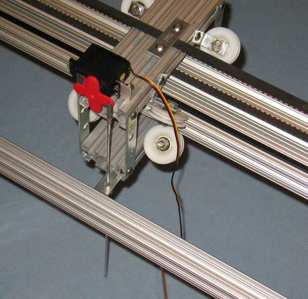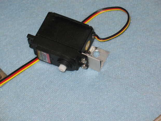 Para nuestro proyecto, estamos utilizando un servo hobby para mover arriba y abajo el efector final (un palo). Para montar el servo, hicimos un pequeño soporte con los agujeros para el servo y la ranura en t. Para mantener el servo control de robar en línea, utilizamos una placa extra.
