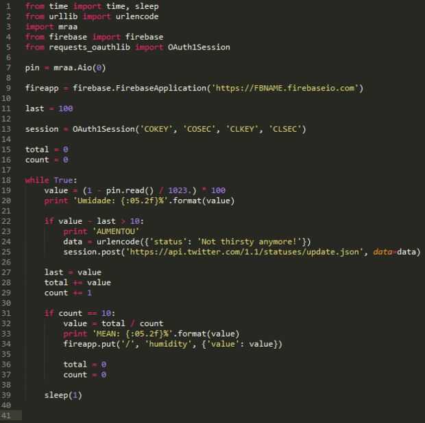 - Cuando la humedad aumenta en un 10% de un segundo a otro, un tweet con el mensaje "no sed ya!" se publica.