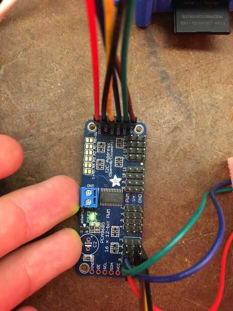 Conectan pines correspondientes en el amplificador PWM y el tablero de Adafruit.