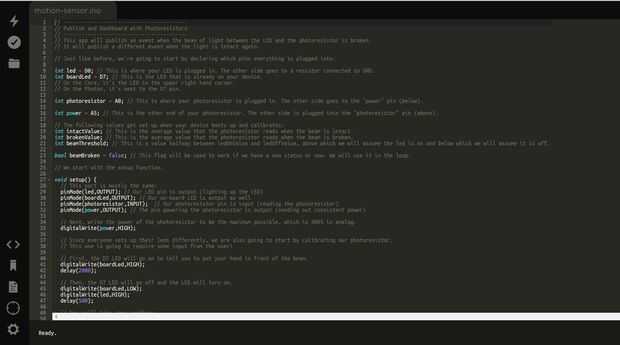 ---/ / Publicar y Dashboard con fotorresistores / /---/ / esta aplicación publicará un evento cuando el haz de luz entre el LED y el fotoresistor se rompe. Publicará un evento diferente cuando la luz está intacta otra vez. / / justo como antes, vamos a comenzar por declarar que pins todo es tapado into.int led = D0; Esto es donde está conectado el LED. El otro lado va a un resistor conectado a GND. int boardLed = D7; Este es el LED que está ya en su dispositivo. En el núcleo, es el LED en la esquina superior derecha. En el fotón, tiene = junto a la fotorresistencia de pin.int D7 A0; Esto es donde se enchufa el fotoresistor. El otro lado va al pin "power" (abajo) .int potencia = A5; Este es el otro extremo de la fotorresistencia. El otro lado está conectado a la clavija "fotoresistor" (above).// los siguientes valores de conseguirán establecer cuando el dispositivo botas arriba y calibra: int intactValue; Este es el valor promedio que el fotorresistor Lee cuando la viga está intacta. int brokenValue; Este es el valor promedio que el fotorresistor Lee cuando la viga se rompe. int beamThreshold; Este es un valor entre ledOnValue y ledOffValue, por encima del cual se asume que el led está en y a continuación que se asume que es off.bool beamBroken = false; Esta bandera se utilizará para marcar si tenemos una nueva situación o ahora. Que utilizaremos en el lazo. / / comenzamos con el programa de instalación function.void setup() {/ esta parte sobre todo es la misma: pinMode(led,OUTPUT); / pin de nuestro LED es salida (iluminación del LED) pinMode(boardLed,OUTPUT); / nuestro LED a bordo es como bien pinMode(photoresistor,INPUT); / nuestro pin fotoresistor es pinMode(power,OUTPUT) (leer el fotoresistor) entrada; / la clavija de alimentación el fotoresistor es salida (envío de potencia constante) / / siguiente , escriba el poder de la fotorresistencia al estar el máximo posible, que es 4095 en analógico. digitalWrite(power,HIGH); Puesto que cada uno configura sus leds diferentemente, también vamos a empezar por calibrar nuestra fotorresistencia. Éste va a requerir algunas entradas del usuario. En primer lugar, el LED D7 pasarán a decirle que ponga la mano delante de la viga. digitalWrite(boardLed,HIGH); Delay(2000); Luego, el D7 LED se apagará y el LED se encenderá. digitalWrite(boardLed,LOW); digitalWrite(led,HIGH); Delay(500); Ahora tomaremos algunas lecturas... int on_1 = analogRead(photoresistor); leer fotoresistor delay(200); esperar 200 milisegundos int on_2 = analogRead(photoresistor); leer fotoresistor delay(300); esperar 300 milisegundos / / ahora flash para hacernos saber que te has tomado las lecturas... digitalWrite(boardLed,HIGH); Delay(100); digitalWrite(boardLed,LOW); Delay(100); digitalWrite(boardLed,HIGH); Delay(100); digitalWrite(boardLed,LOW); Delay(100); Ahora el D7 pondrá a decirle que quite la mano... digitalWrite(boardLed,HIGH); Delay(2000); El D7 LED dará vuelta apagado.. digitalWrite(boardLed,LOW); // ... Y vamos a tomar dos lecturas más. int off_1 = analogRead(photoresistor); leer fotoresistor delay(200); esperar 200 milisegundos int off_2 = analogRead(photoresistor); leer fotoresistor delay(1000); esperar 1 segundo / Flash ahora el D7 LED encendido y apagado tres veces para hacernos saber que estamos listos para ir! digitalWrite(boardLed,HIGH); Delay(100); digitalWrite(boardLed,LOW); Delay(100); digitalWrite(boardLed,HIGH); Delay(100); digitalWrite(boardLed,LOW); Delay(100); digitalWrite(boardLed,HIGH); Delay(100); digitalWrite(boardLed,LOW); Ahora que media "en" y "off" valores para obtener una idea de lo que la resistencia será ser cuando el LED está encendido y apagado intactValue = (on_1 + on_2) / 2; brokenValue = (off_1 + off_2) / 2; Vamos a calcular el valor entre ledOn y ledOff, sobre el cual se asume que el led es en y por debajo de la que asumimos el led está apagado. beamThreshold = (intactValue + brokenValue) / 2;} Ahora para el loop() loop.void {/ * en esta función de lazo, vamos a comprobar si la viga se ha rota. Cuando el estado de los cambios de la viga, se entregará un Spark.publish() a la nube para que si queremos, podemos comprobar de otros dispositivos cuando el LED esté encendido o apagado. Te también encendemos el LED D7 cuando el fotorresistor detecta un breakagse de la viga. * / if (analogRead(photoresistor) > beamThreshold) {/ * si usted está por encima del umbral, asumiremos que la viga está intacta. Si la viga estaba intacta antes, sin embargo, no necesitamos cambiar nada. Usaremos la bandera beamBroken que nos ayude a averiguar esto. Esta bandera controla el estado actual de la viga. Después de que la viga se rompe, se establece a TRUE y cuando vuelve a conectar la viga está establecida en FALSE. * / if (beamBroken == true) {/ / si la viga estaba roto antes, entonces esta es una situación nueva. / será enviar una publicación a la nube y encender el LED. / una publicación, enviar a dispositivos... Spark.Publish("beamStatus","Intact",60,Private); Y parpadeará el LED a bordo encendido y apagado. digitalWrite(boardLed,HIGH); Delay(500); digitalWrite(boardLed,LOW); Por último, establece el indicador para reflejar el estado actual de la viga. beamBroken = false; } else {/ / de lo contrario, esto no es un nuevo estado, y no tenemos que hacer nada.}} más {/ / si usted está por debajo del umbral, la viga se rompe probablemente. Si (beamBroken == false) {/ / envía una publicación... Spark.Publish("beamStatus","Broken",60,Private); Y parpadeará el LED a bordo encendido y apagado. digitalWrite(boardLed,HIGH); Delay(500); digitalWrite(boardLed,LOW); Por último, establece el indicador para reflejar el estado actual de la viga. beamBroken = true; {}} else {/ / de lo contrario, esto no es un nuevo estado, y no tenemos que hacer nada.}}}