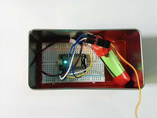 Para este diseño se necesita un envase redondo como el de la foto, dos agujeros en uno de los lados a través del cual puede caer comida al tanque. Usé cinta de doble cara y lo pegado al servo y cuando enciendo el servo la comida caerá en el tanque.