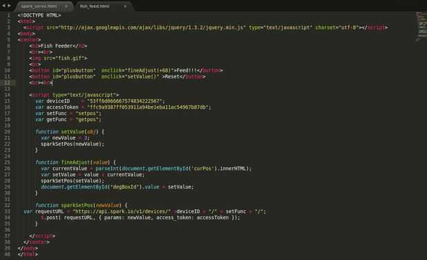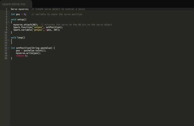 Servo myservo; // create servo object to control a servo<br>int pos = 0; // variable to store the servo position void setup() { myservo.attach(A0); // attaches the servo on the A0 pin to the servo object Spark.function("setpos", setPosition); Spark.variable("getpos", &pos, INT); } void loop() { } int setPosition(String posValue) { pos = posValue.toInt(); myservo.write(pos); return 0; } En el lado de la página web de cosas que el código tiene algunos cambios, el nuevo archivo HTML se puede encontrar en los accesorios todo lo que necesitas es descargar el archivo e ingrese su Token de acceso en un campo donde dice << token de acceso de >> y el ID de la base en un campo donde dice << ID de la base del >>. Después de introducir los campos guardar y ejecutar en su navegador y asegúrese de que tiene JavaScript activado.