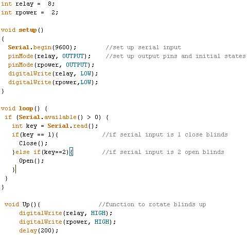 Configurar un sketch de arduino que hace lo que quieras al recibir la entrada de un cierto carácter del puerto serial. Esto se hace a partir de la serie conversatin Serial.begin(9600); en la configuración. Luego en el bucle si (Serial.available() > 0) comprueba de entrada serial y Serial.read(); Devuelve una cadena de texto de entrada. El ejemplo de que me referiré a lo largo abre y cierra mi persianas para mí. Puedes ver que mi Arduino abrirá mi persianas al recibir el carácter 2 y cerrará después de recibir el carácter 1.