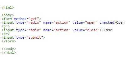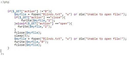 El formulario es enviado a mi propia página y se maneja mi PHP. Esto es donde la magia sucede. Si recibe una solicitud get, abre mi archivo Blinds.txt en el servidor. Cuando se abre el archivo en el modo "w" se borra todo en el archivo y luego escribe lo que dices que en el archivo en blanco. Tengo mina escribir uno o dos, entonces sustituirla por un cero después de cinco segundos. El retraso viene de sleep(5);. Tengo el número, ya sea uno o dos, escrito el archivo de sólo cinco segundos porque estoy seguro que mi app de procesamiento puede detectar el cambio durante ese intervalo. Restablecerla a cero luego lo contrario, si quiero abrir mi tonos dos veces en una fila, la segunda vez que actualicé Blinds.txt mi app de procesamiento no veía ninguna diferencia y por lo tanto no hacer nada.