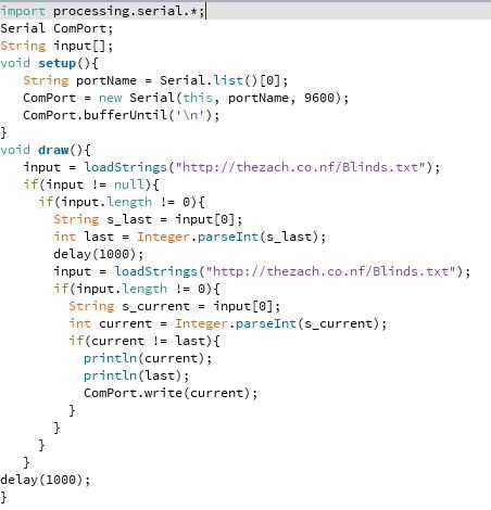 El punto de la aplicación del tratamiento es recuperar los datos desde el archivo de texto en su servidor y alimentación, a través del puerto serial al Arduino. Para enviar los datos que necesitamos la librería de procesamiento de serie. Para empezar hemos creado el puerto serie a la misma velocidad en baudios como fijamos el Arduino (9600). En el circuito del sorteo empezamos por recuperar los datos de mi archivo de texto mediante loadstrings("url"); que devuelve una matriz de cadenas, cada elemento es una línea de texto del documento. Yo entonces analizar el elemento de la matriz en un int así que es una primitiva en lugar de una variable de referencia, y puedo comparar su valor. Después de esperar a un segundo puedo recuperar otro valor y si son diferentes yo se que ha pasado algo y necesito contar mi Arduino, así que le mande los datos utilizando ComPort.write(data);. También pruebo nulidad en todo así que no accidentalmente pasan de datos complementados.