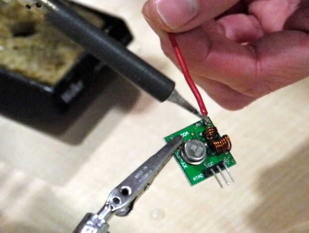 La primera tarea es conectar una antena al módulo transmisor. Esto requiere algunas básicas de soldadura. Si sabes lo que haces solo exactamente 87mm de alambre en "Hormiga" en el módulo de soldadura y pasemos al siguiente paso.